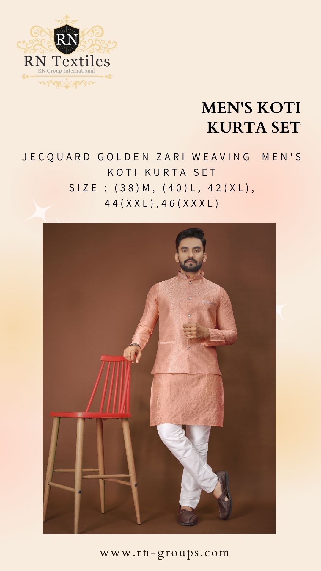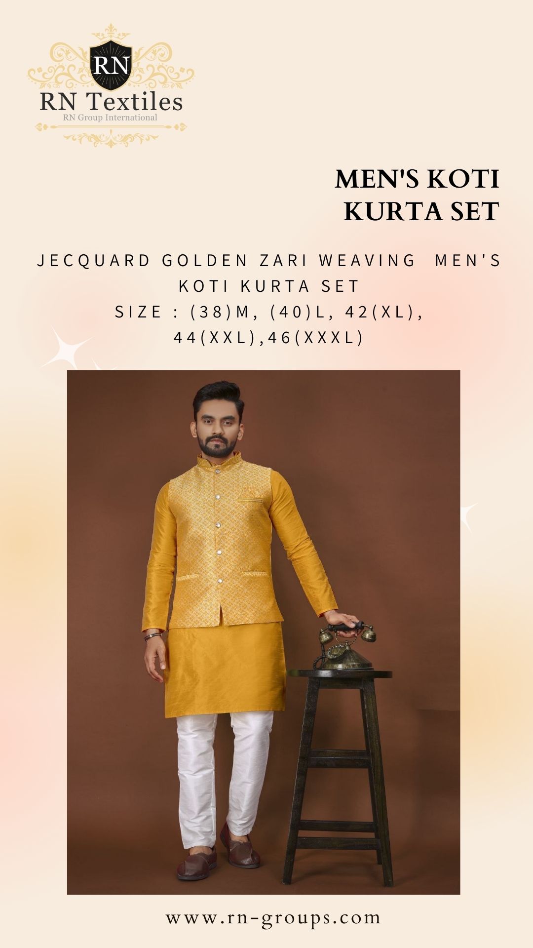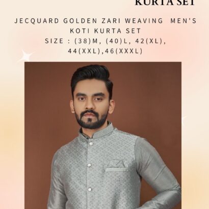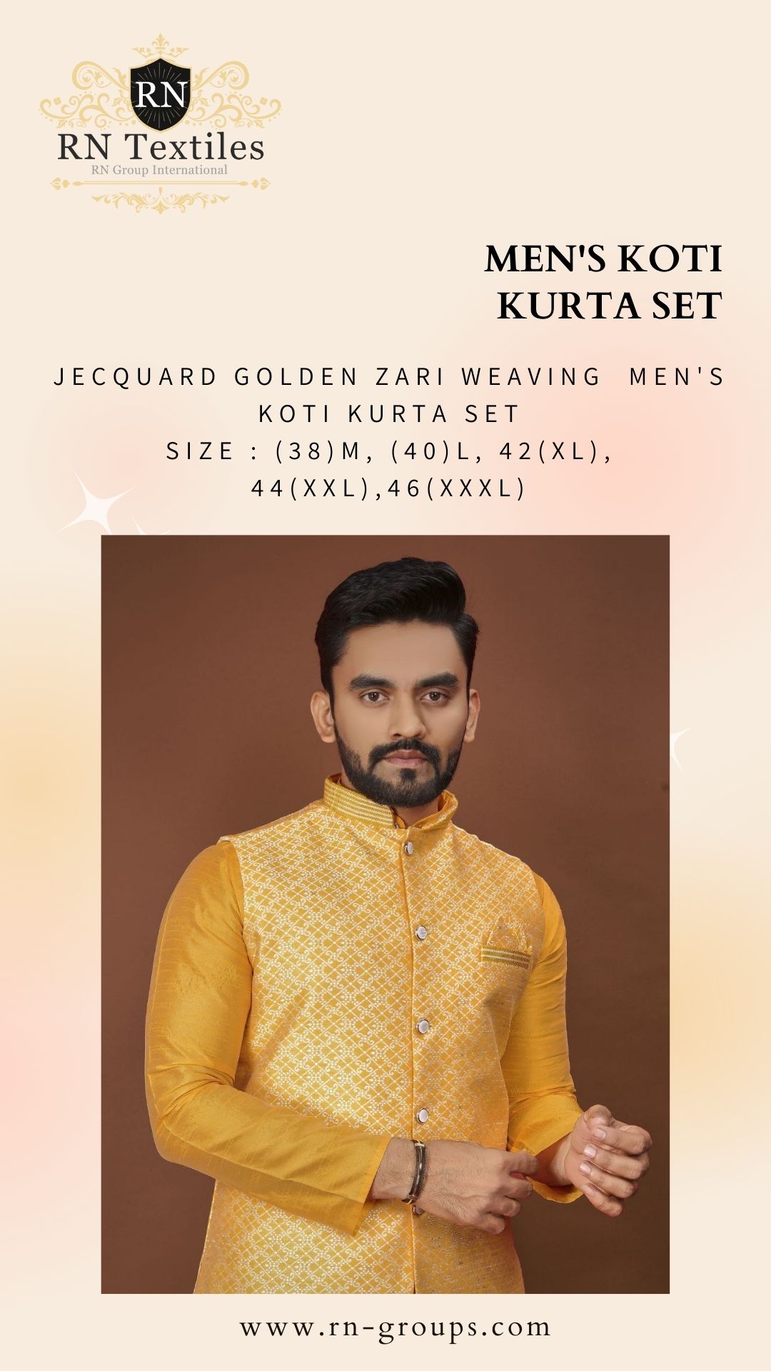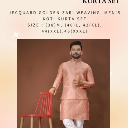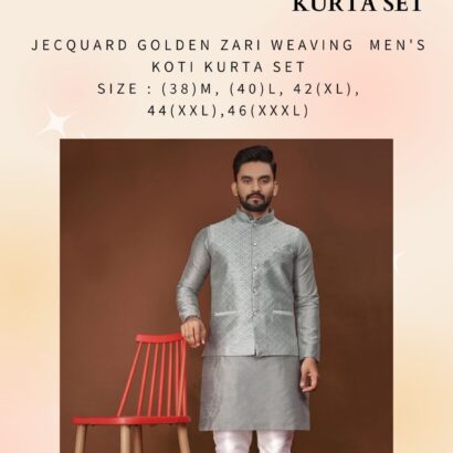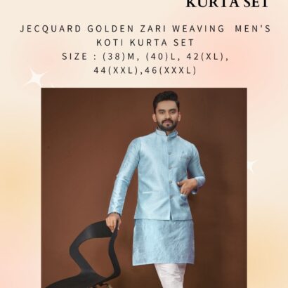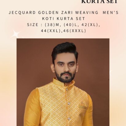 Try a boy look with this timeless multicolour men’s koti. The pure silk fabric with jequard golden zari weaving koti using to attain these bright coloured names all over