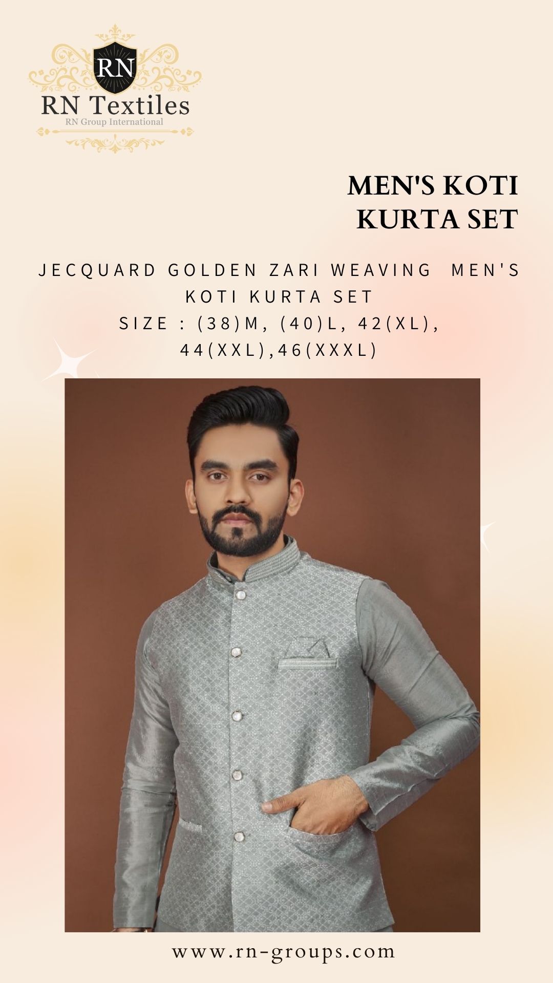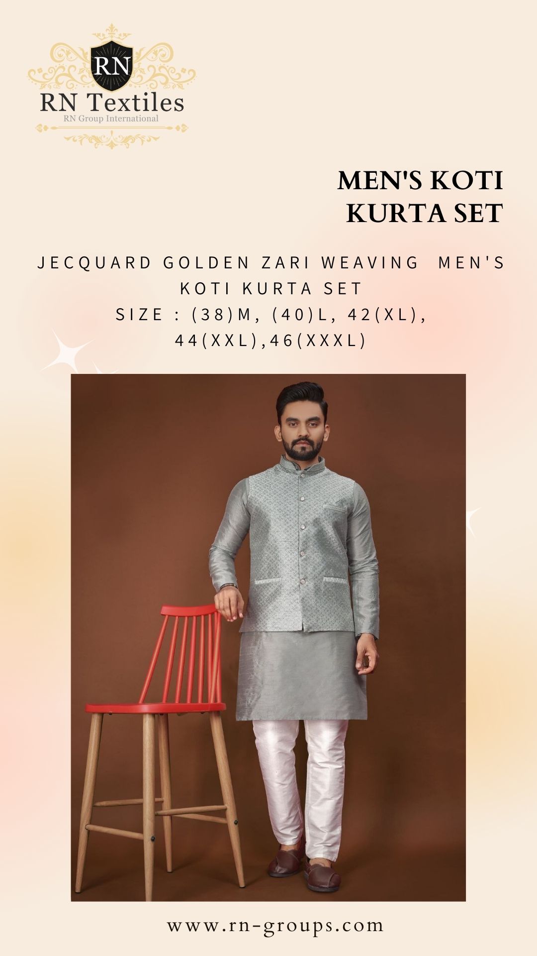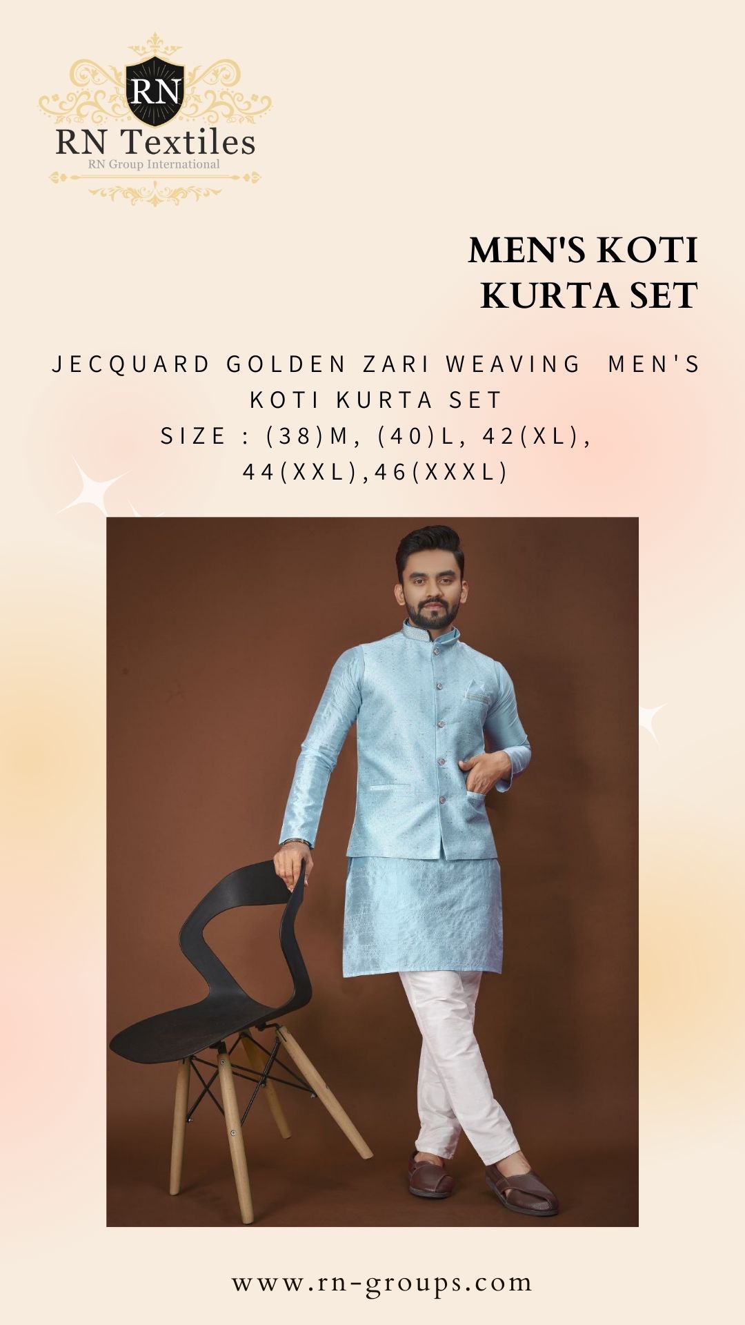 Try a boy look with this timeless multicolour men’s koti. The pure silk fabric with jequard golden zari weaving koti using to attain these bright coloured names all over