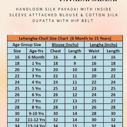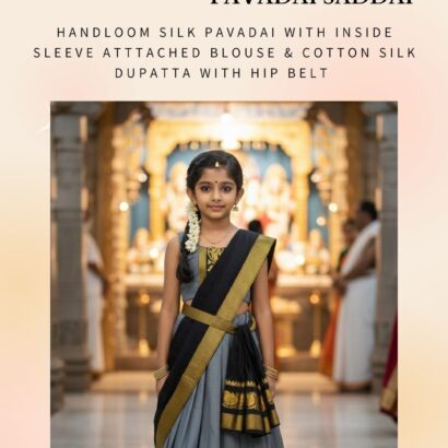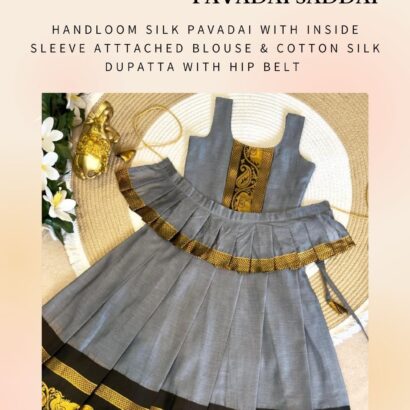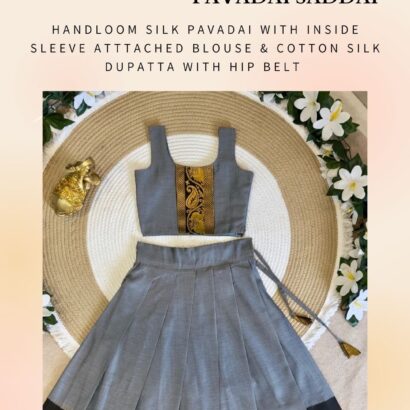 Handloom silk pavadai with inside sleeve atttached blouse & cotton silk dupatta with hip belt
