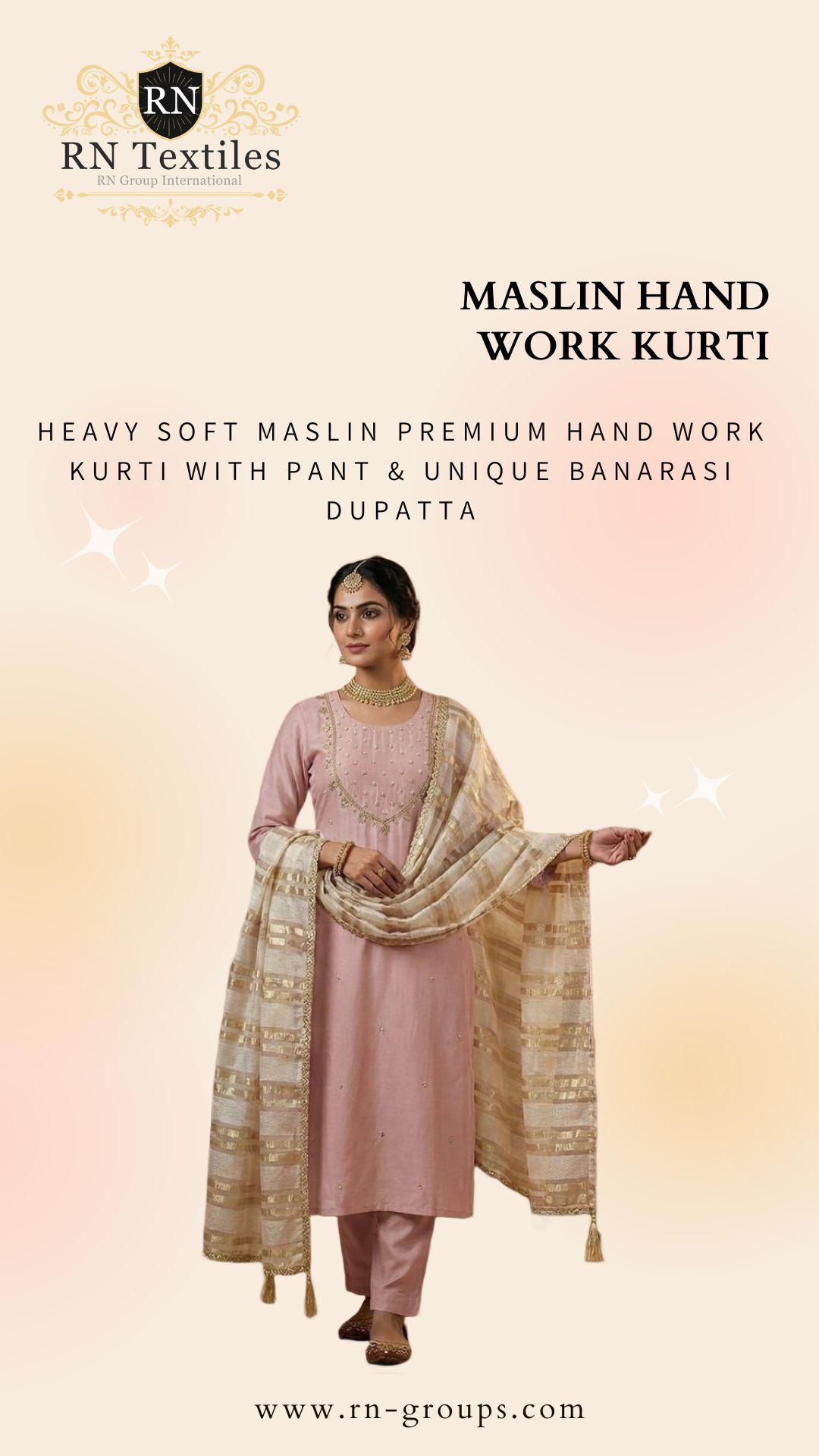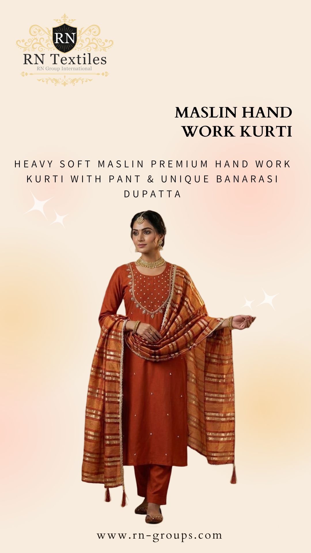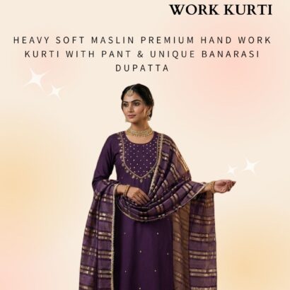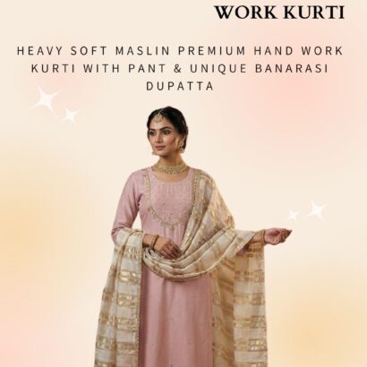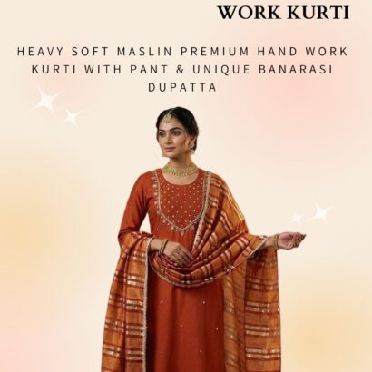 Heavy soft maslin premium hand work kurti with pant & unique banarasi dupatta