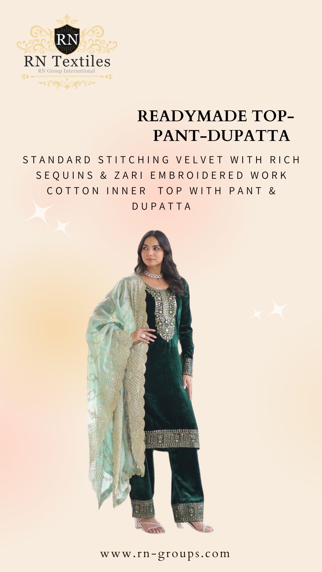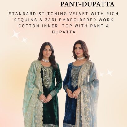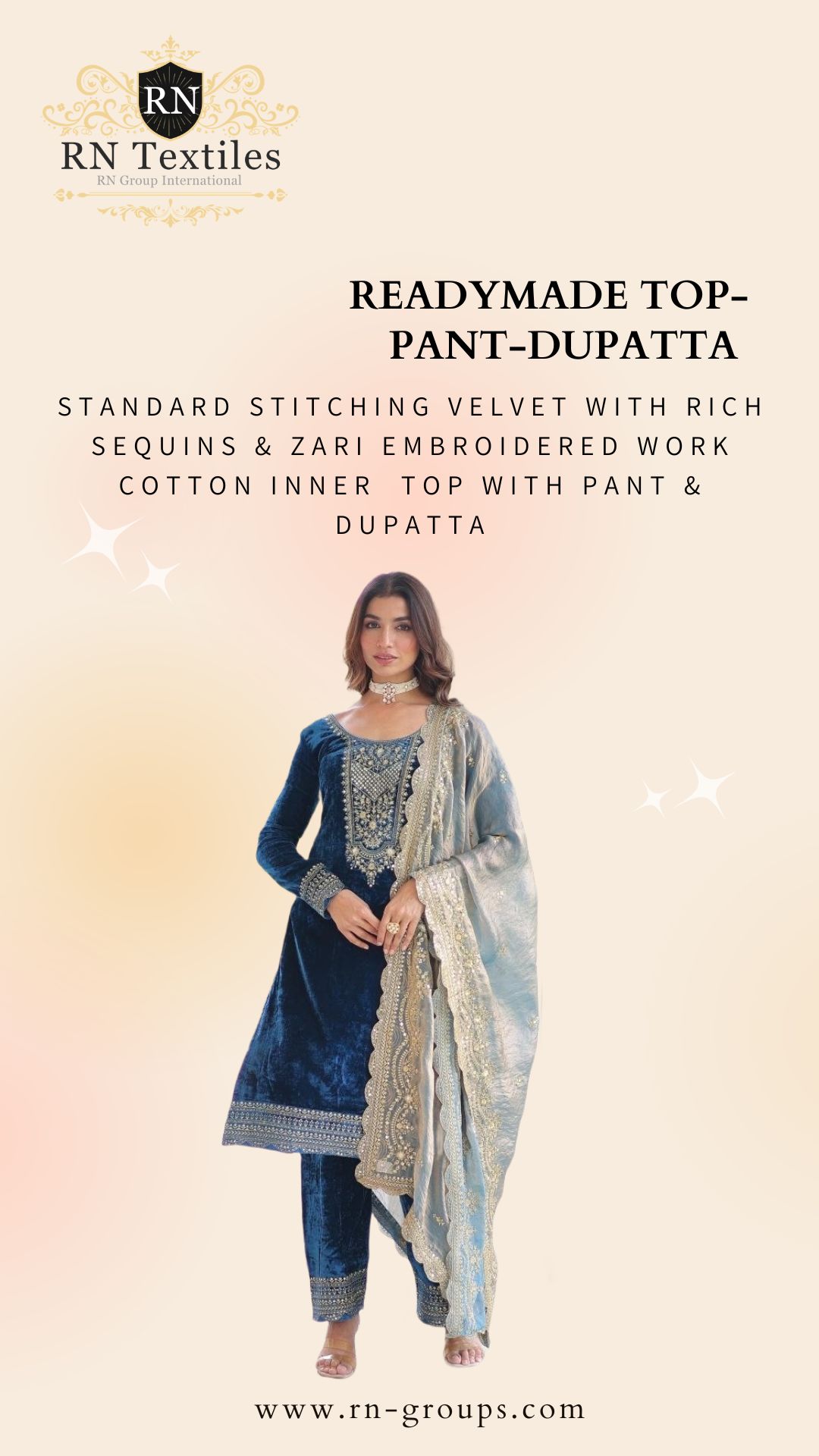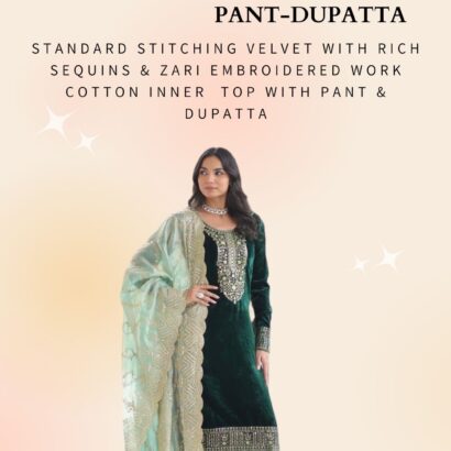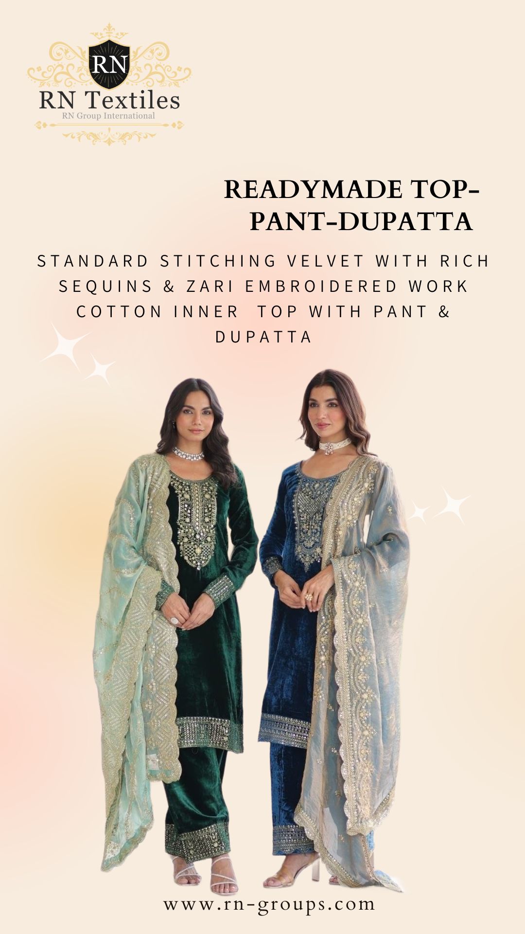 Fabrics & Work : Standard Stitching Velvet With Rich Sequins & Zari Embroidered Work Cotton Inner Top With Pant & Dupatta