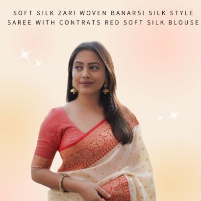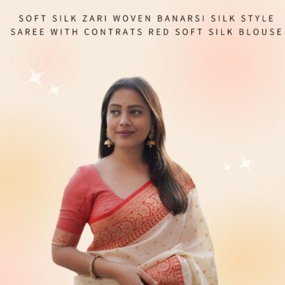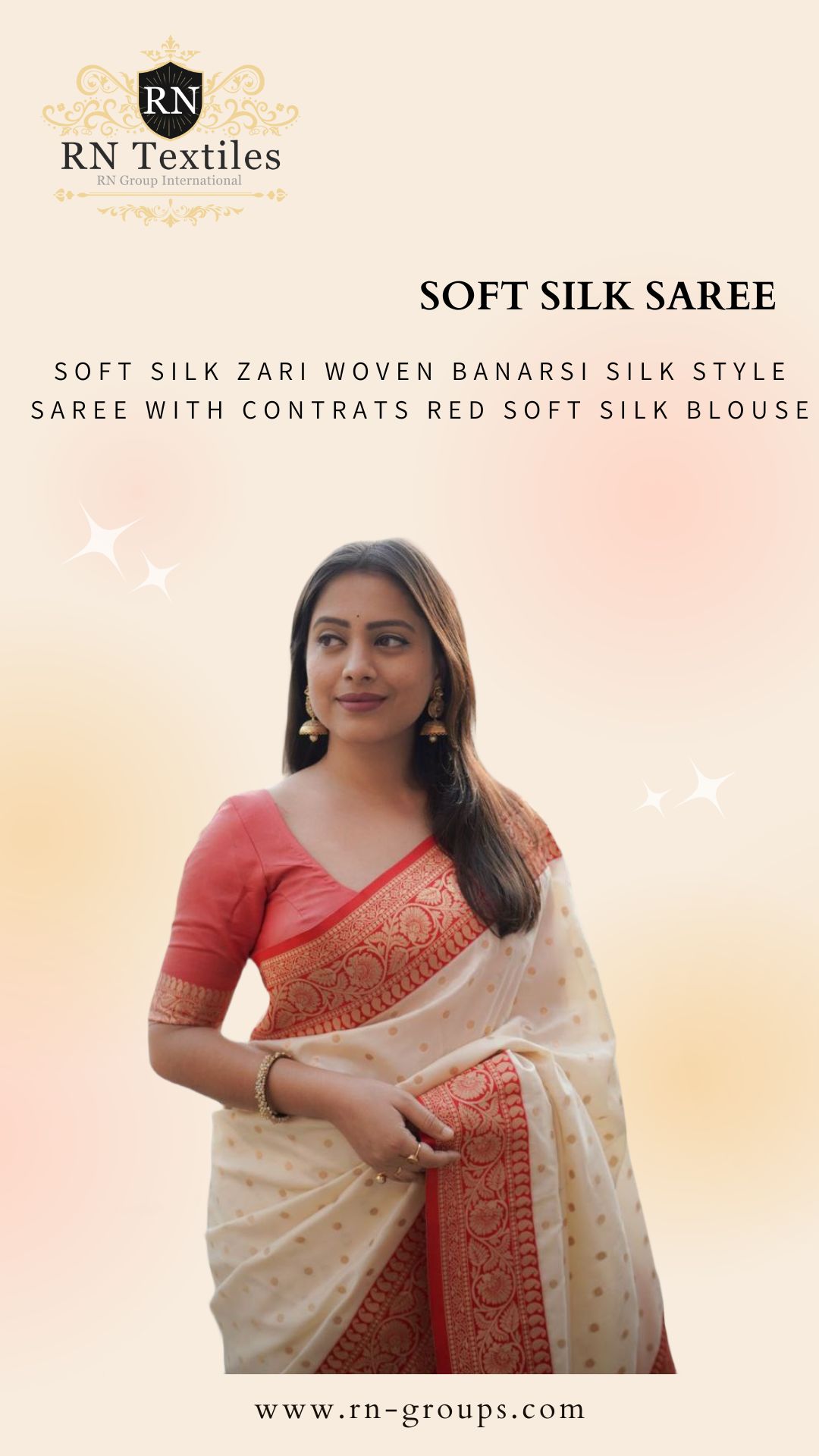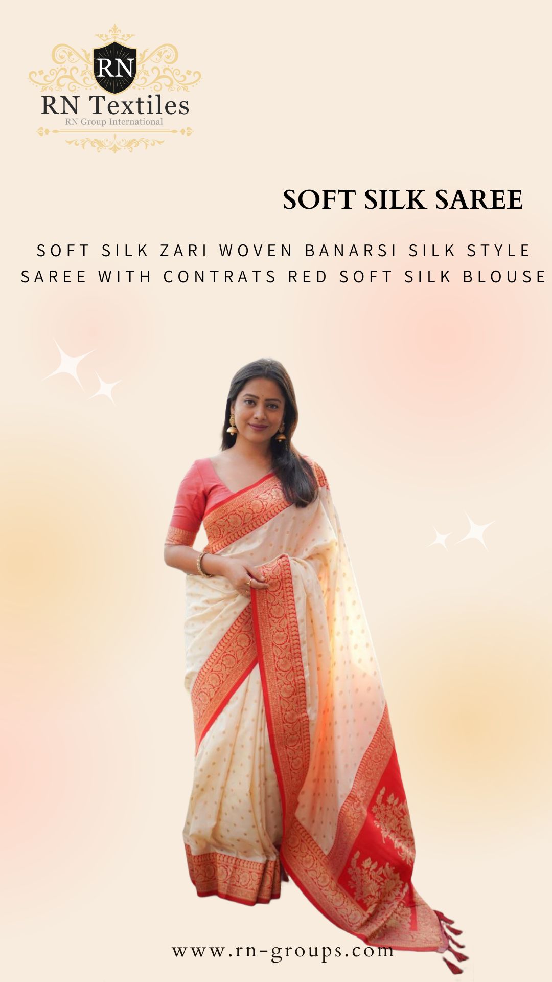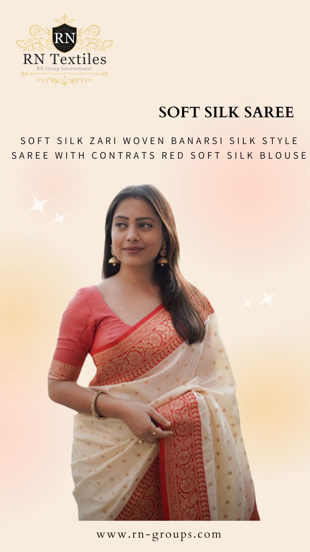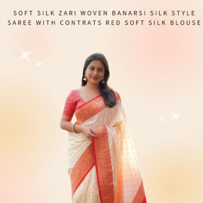 Soft Silk Zari Woven Banarsi Silk Style Saree With Contrats Red Soft Silk Blouse