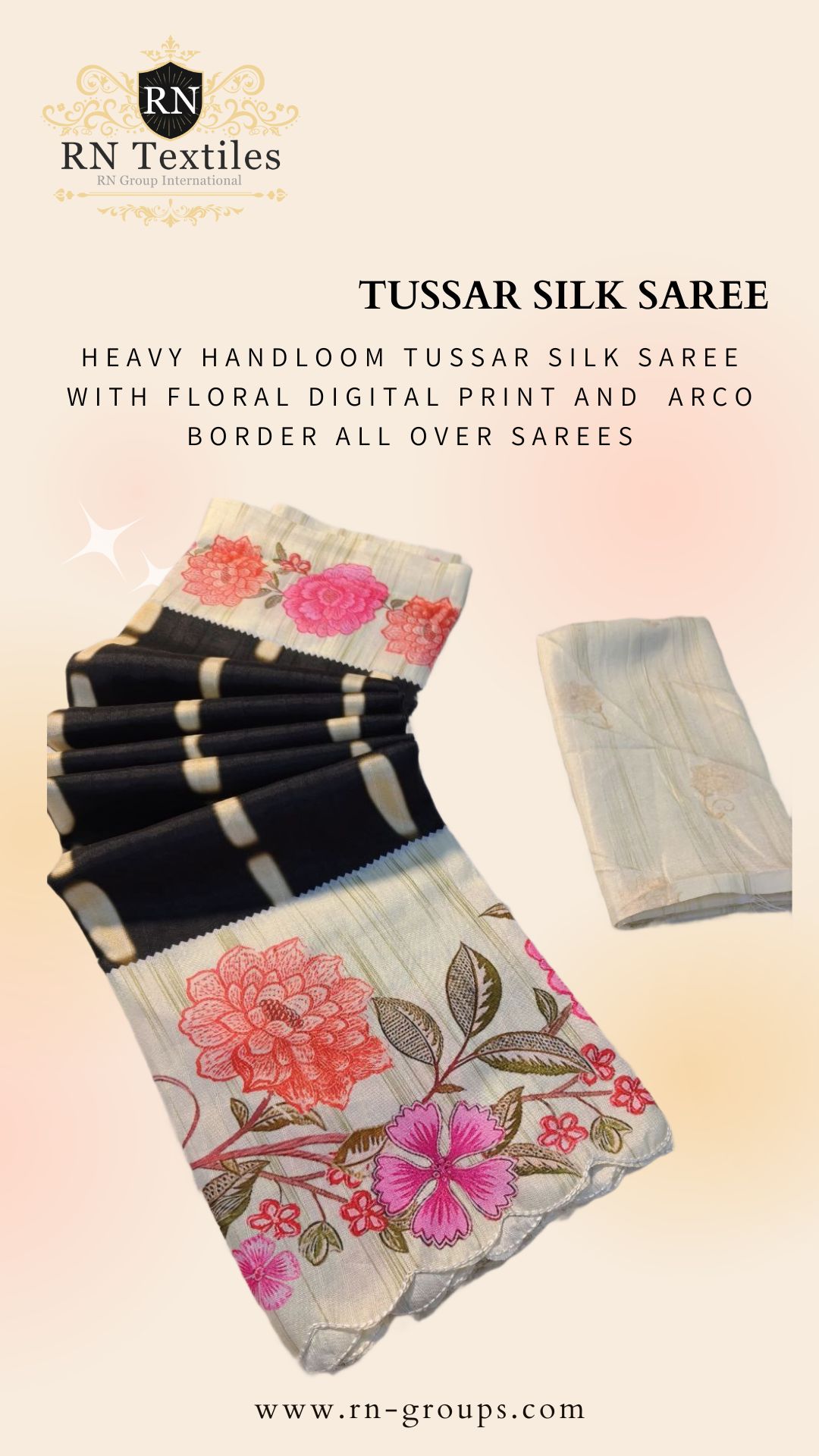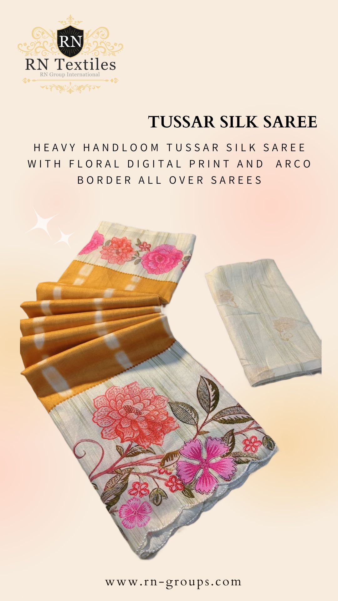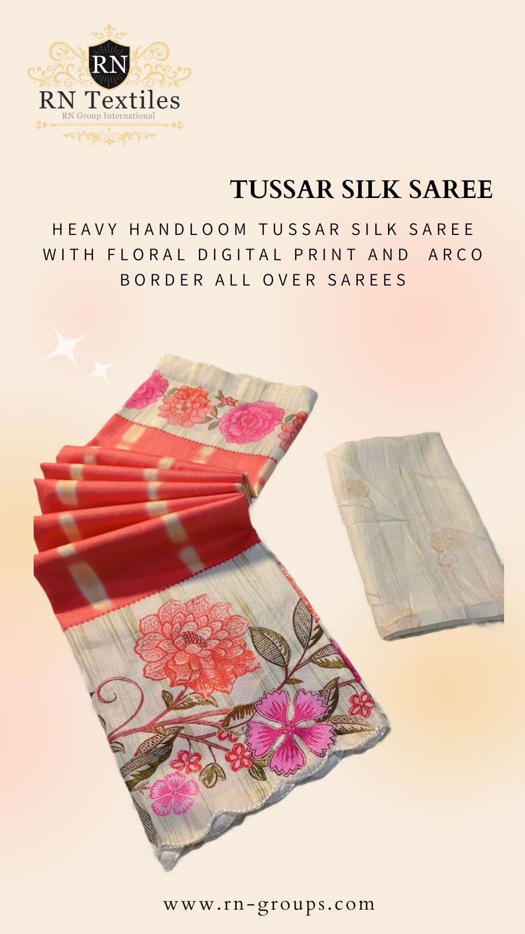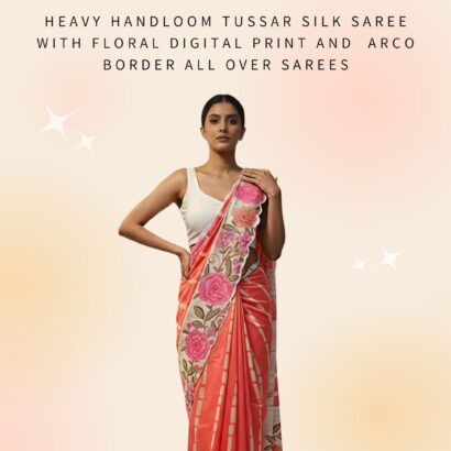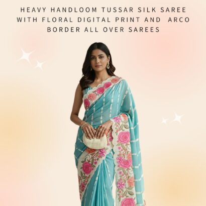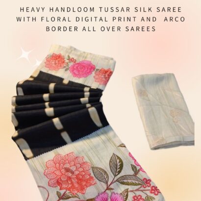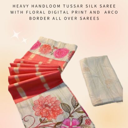 Heavy Handloom Tussar Silk Saree With Floral Digital Print And Arco Border All Over Sarees Attached With Perfectly Matched Pallu & Blouse Peice