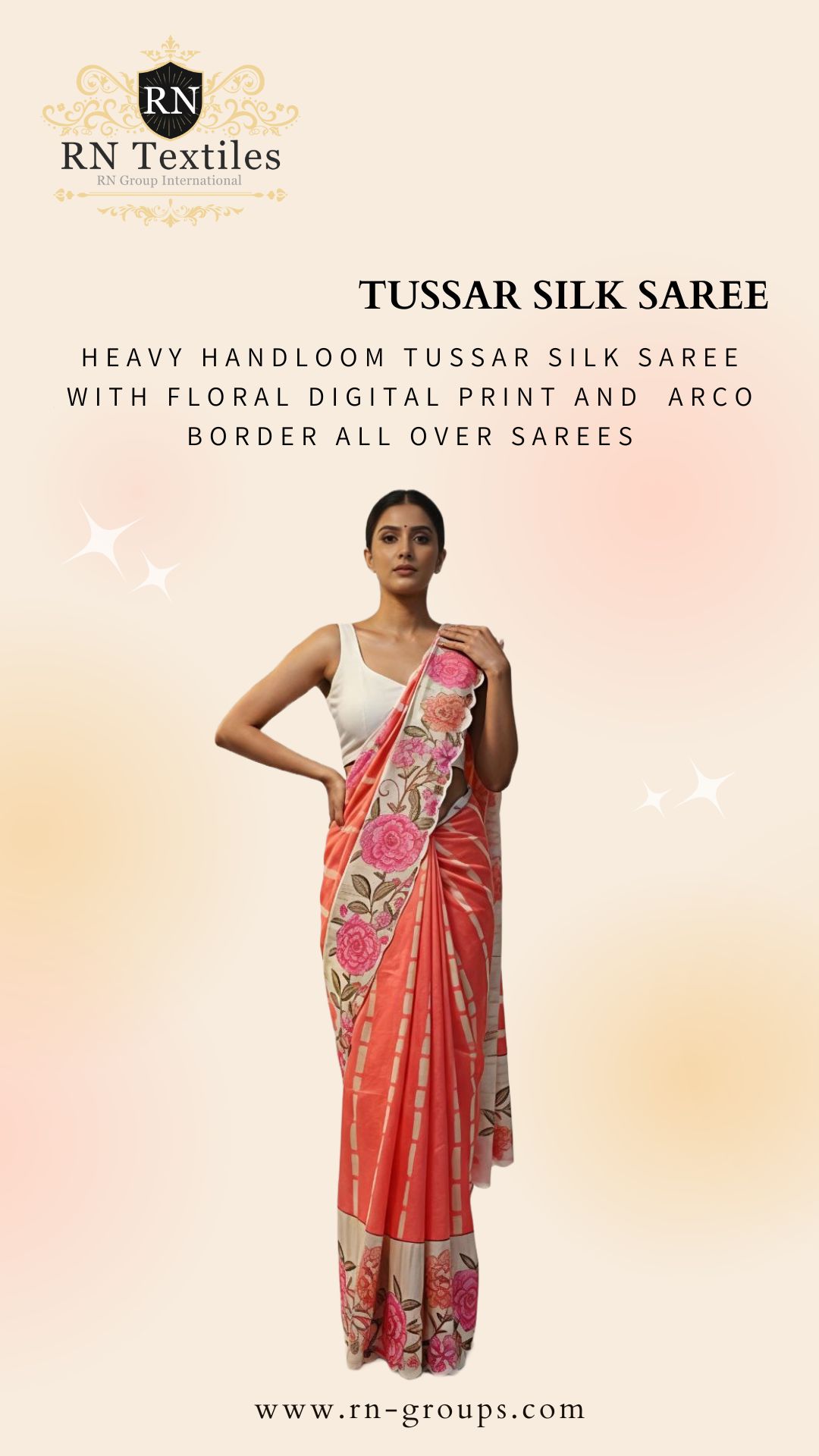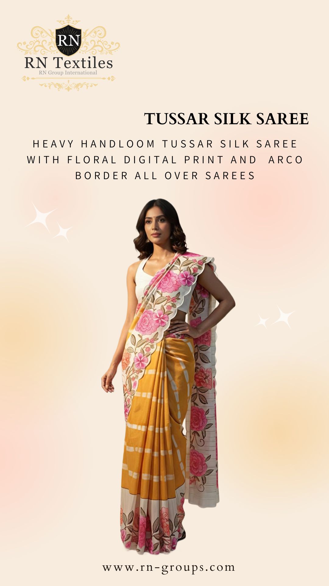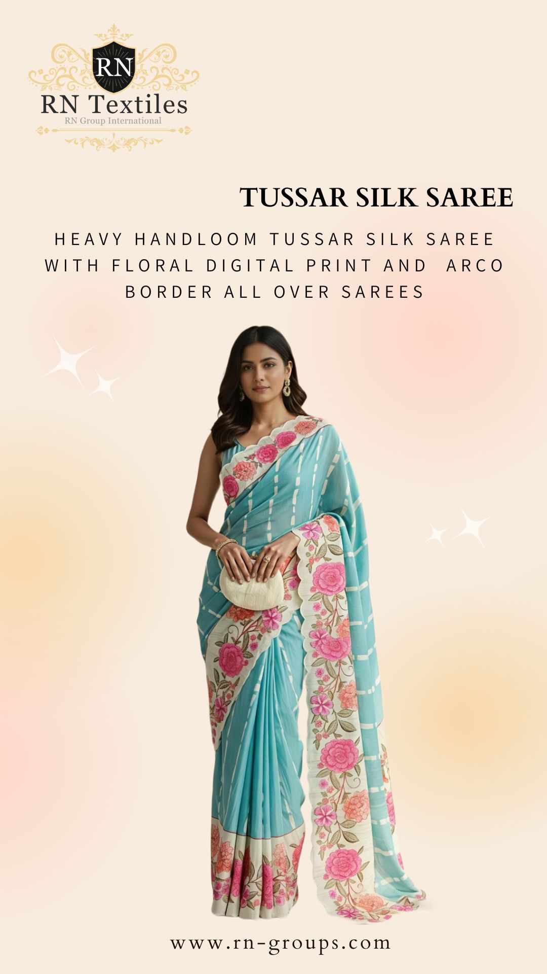 Heavy Handloom Tussar Silk Saree With Floral Digital Print And Arco Border All Over Sarees Attached With Perfectly Matched Pallu & Blouse Peice