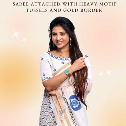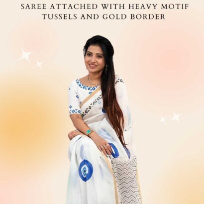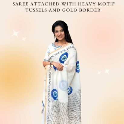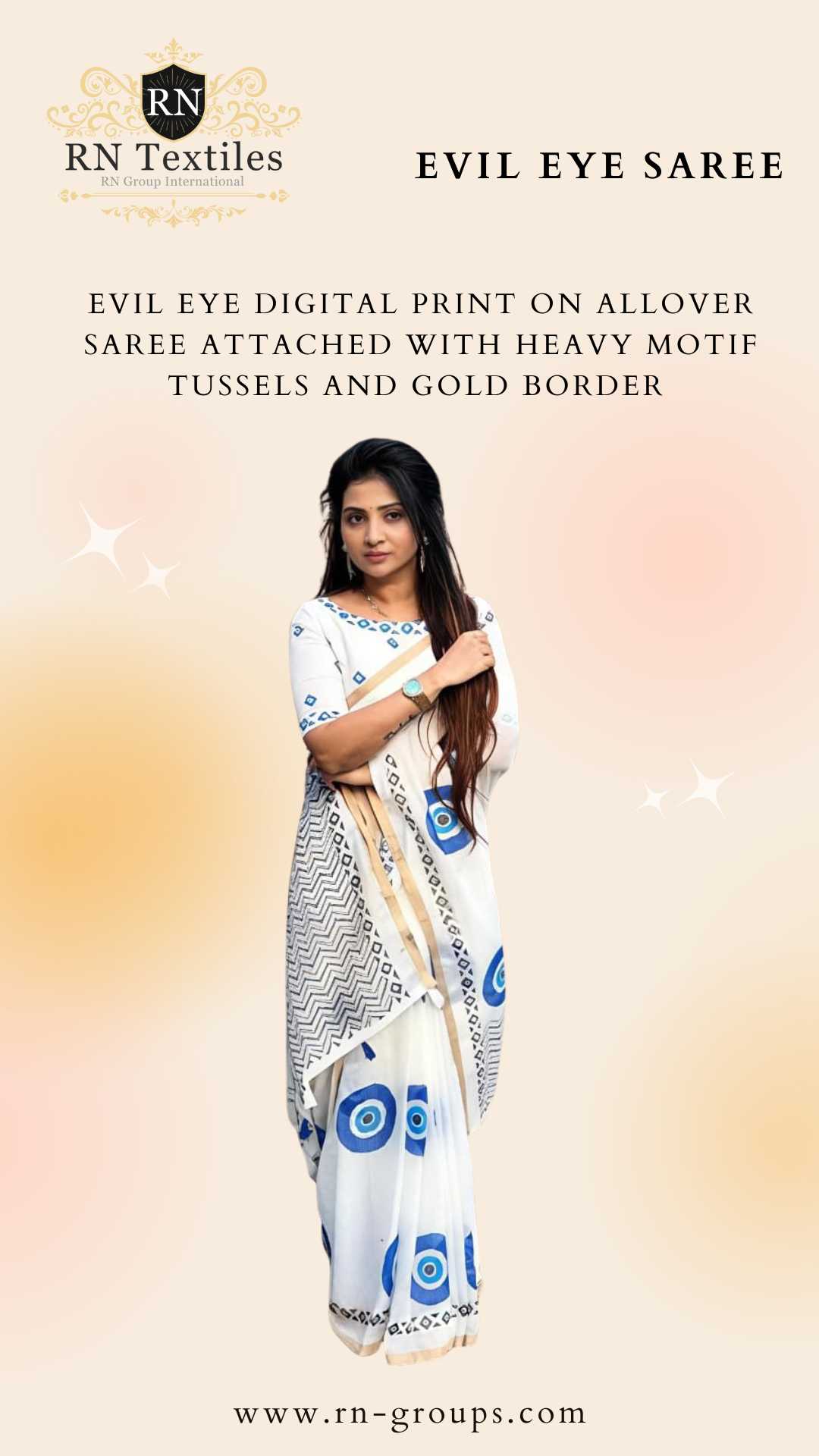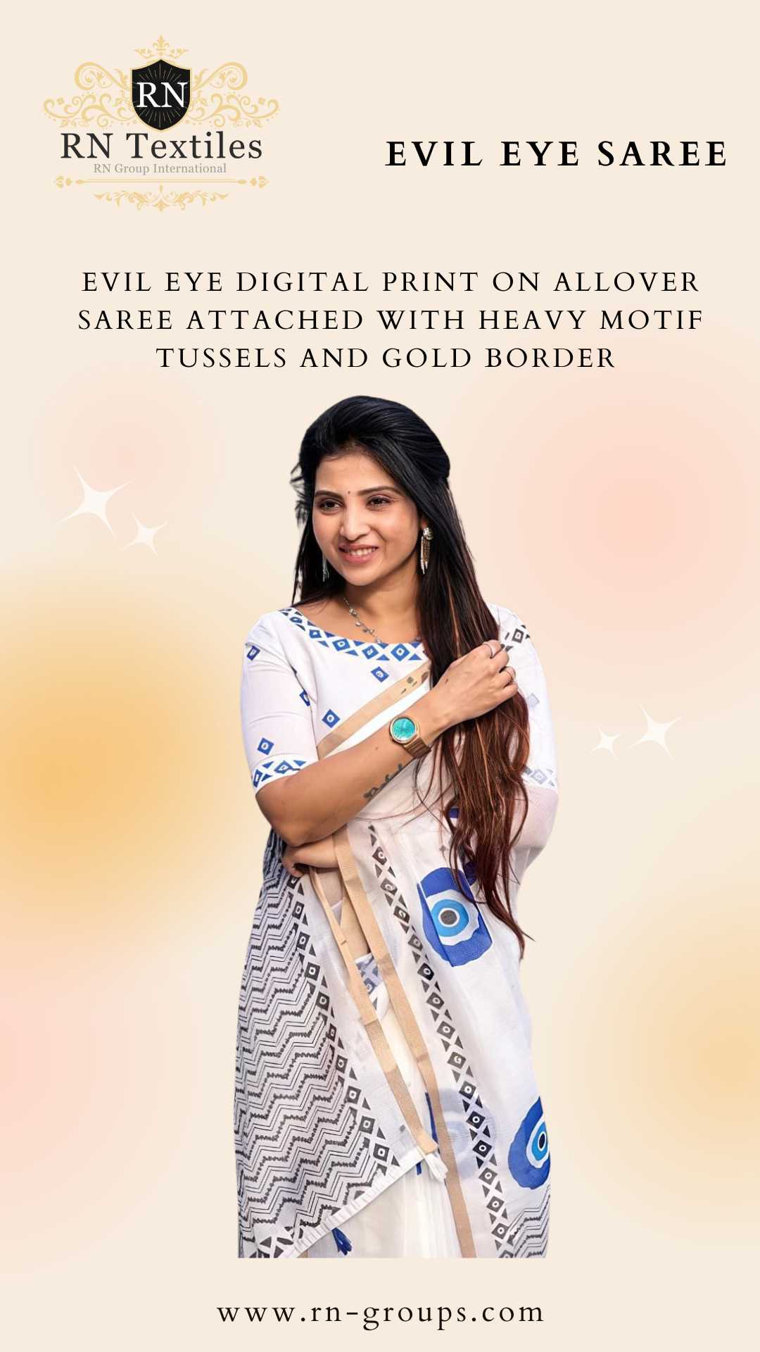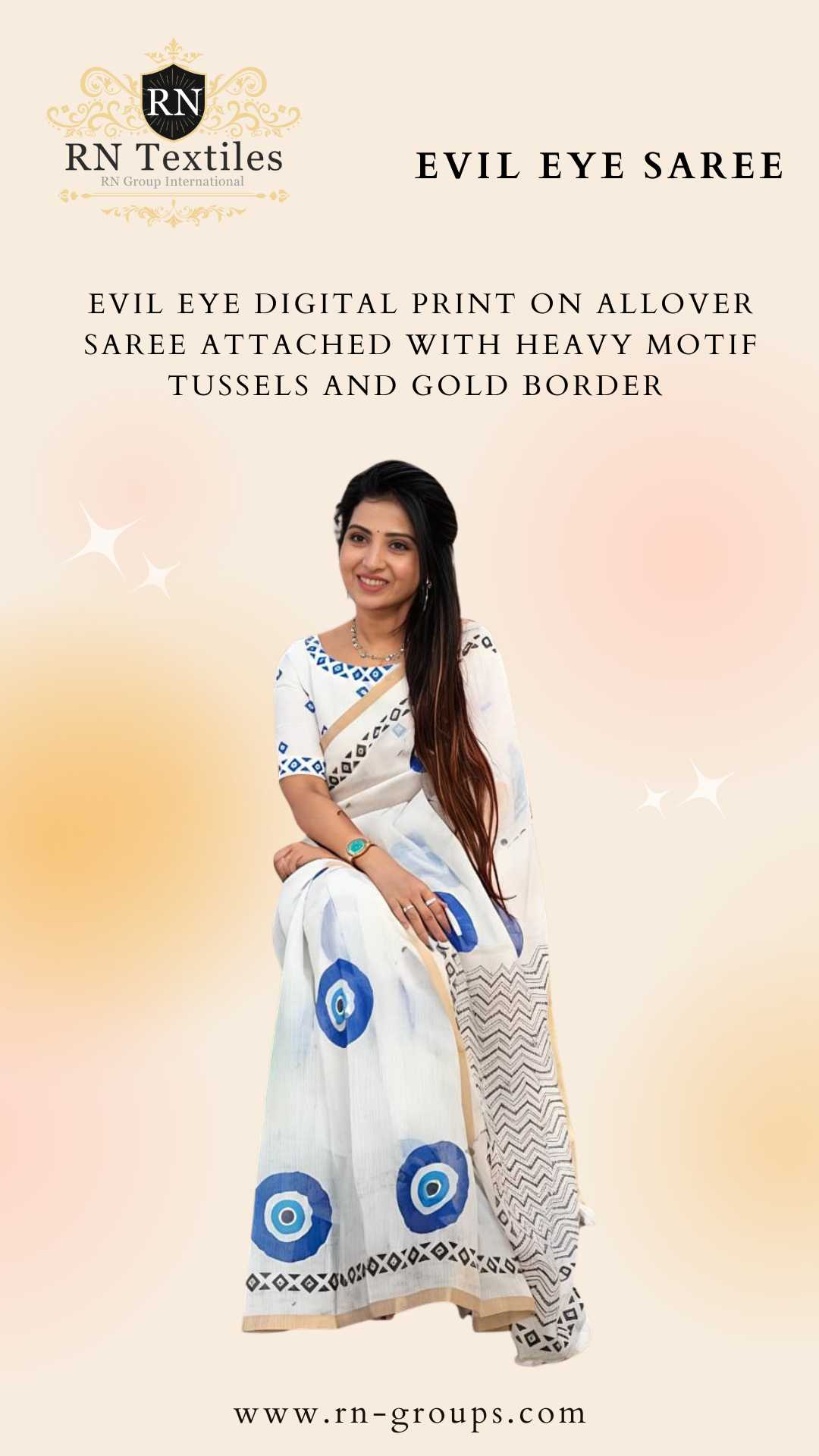 Heavy linen blooming saree evil eye digital print on allover saree attached with heavy motif Tussels and gold border with PERFECTLY MATCHED blouse piece and pallu.