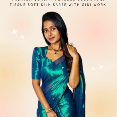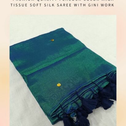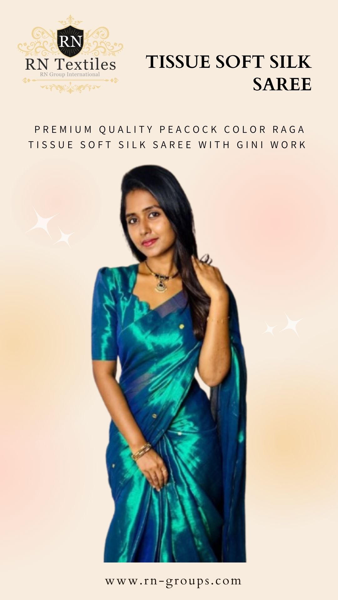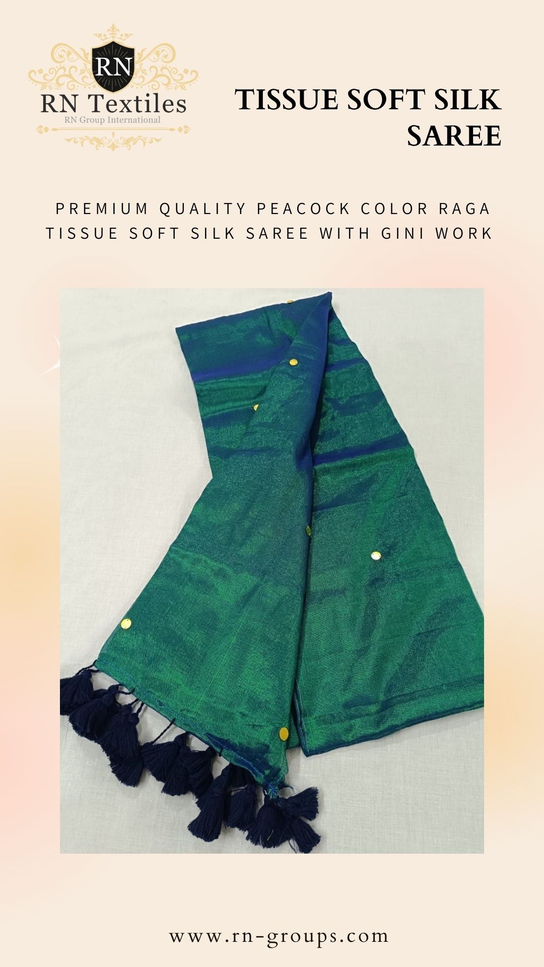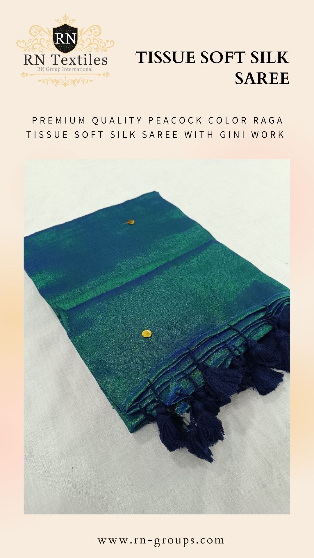 Premium Quality peacock color Raga Tissue Soft Silk Saree with gini work